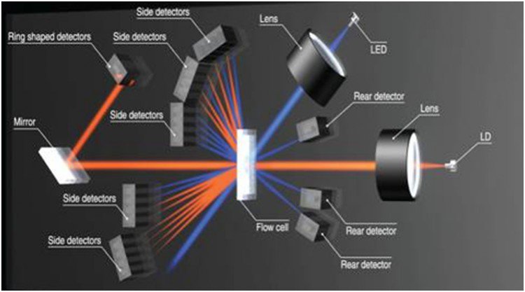 В основе работы лазерного анализатора частиц лежит теория рассеяния света. Через специальную емкость с непрерывно перемешивающейся смесью для анализа проходит луч лазера аппарата, излучение регистрируется детектором под различными углами. В зависимости от зарегистрированных показателей (угол, интенсивность рассеянного излучения) осуществляется гранулометрический анализ.