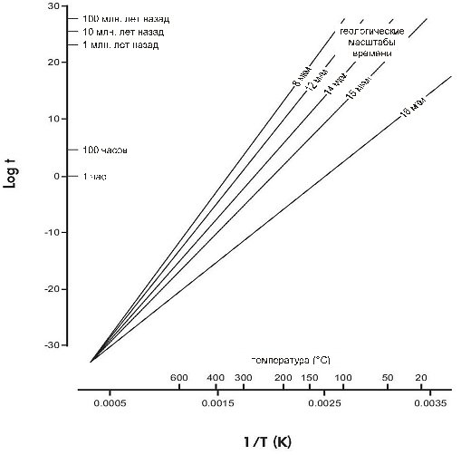 и экстраполированы до геологических масштабов времени для длин следов от 8